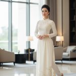 - Đính kết nhẹ nhàng: Một vài hạt đá, ngọc trai nhỏ ở cổ áo, tay áo hoặc dọc tà áo, tạo điểm nhấn lấp lánh vừa đủ.